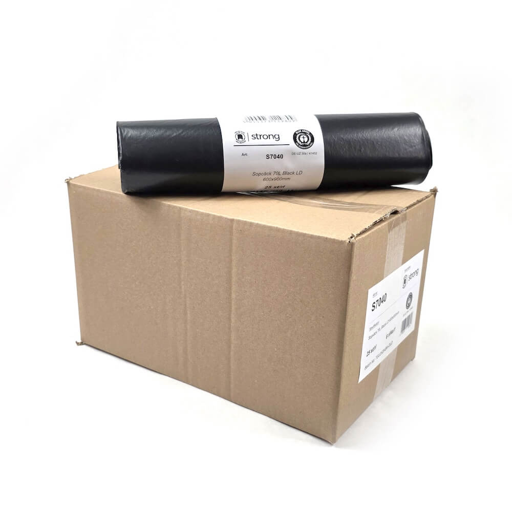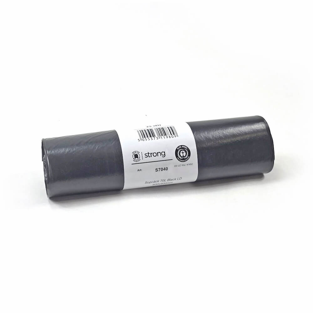 Zwarte vuilniszak 70 L voornamelijk bedoeld voor lichtere afvalstoffen. Geschikt voor huis, tuin, kantoor en licht industrieel gebruik.